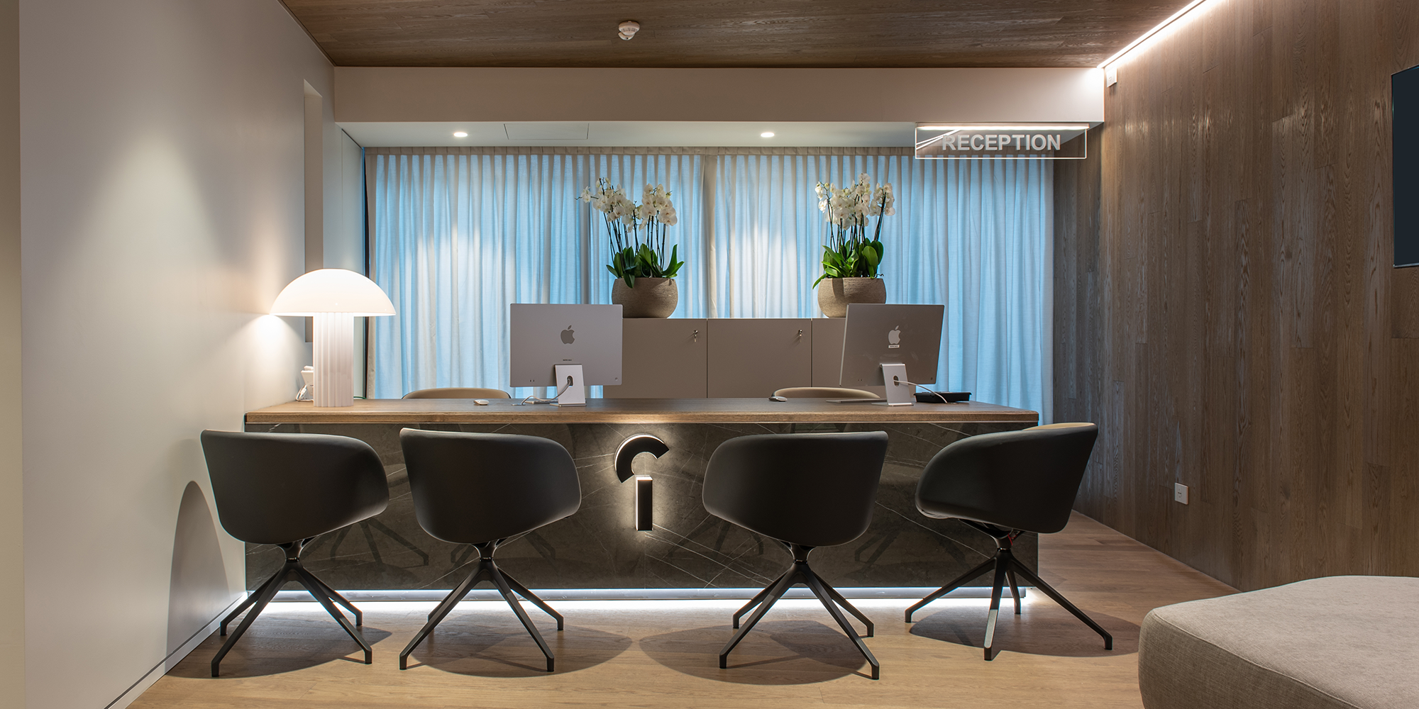 Il primo piano è dedicato all’esperienza del paziente. Qui si trovano reception, spazi di attesa e aree per le consulenze mediche. L’ambiente è caratterizzato da un design contemporaneo e luminoso, progettato per creare un’atmosfera professionale ma rassicurante.
