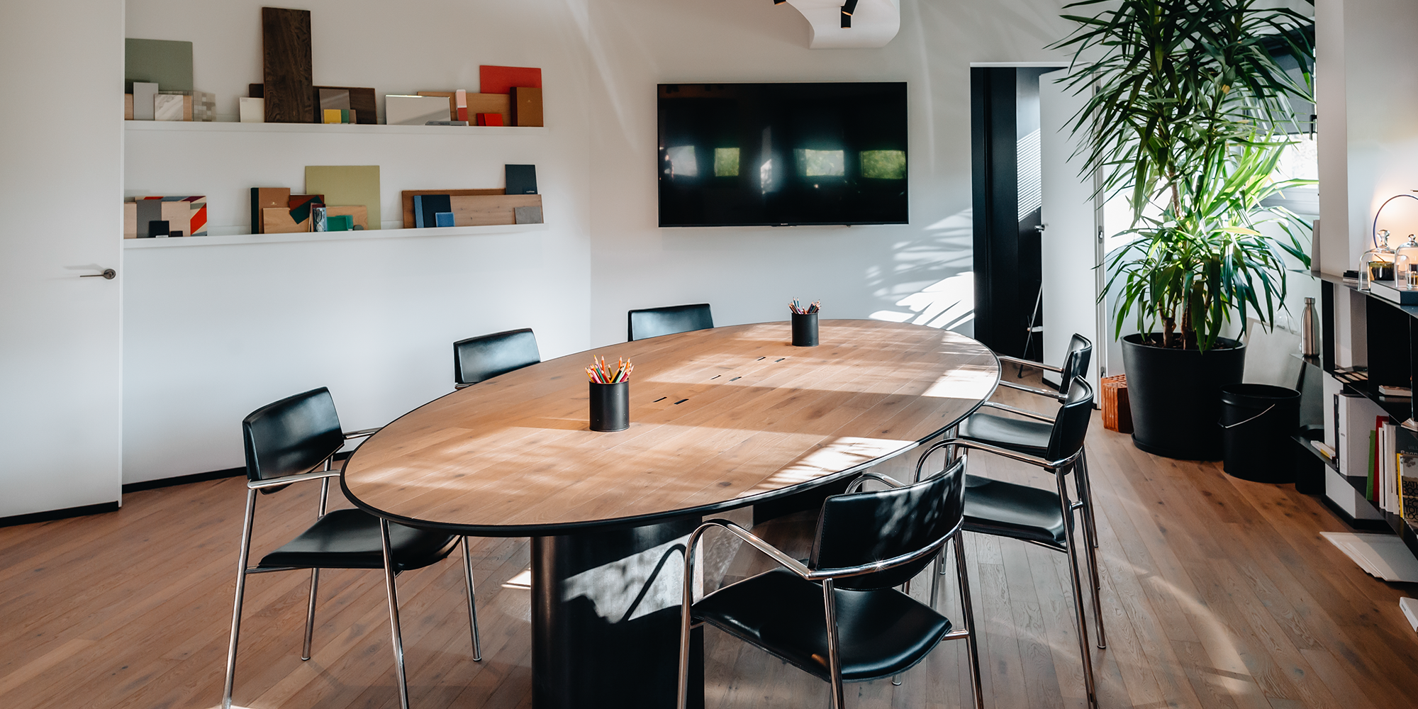 L’area riunioni diventa il fulcro dello spazio: un luogo pensato per presentare i progetti, confrontarsi con i clienti e condividere idee.
