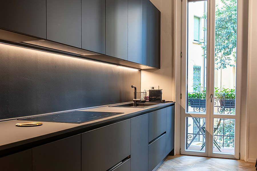 The renovation breathed new life into a Milan apartment: herringbone parquet, a total black kitchen, modern bathrooms, and pop details that make each space unique.