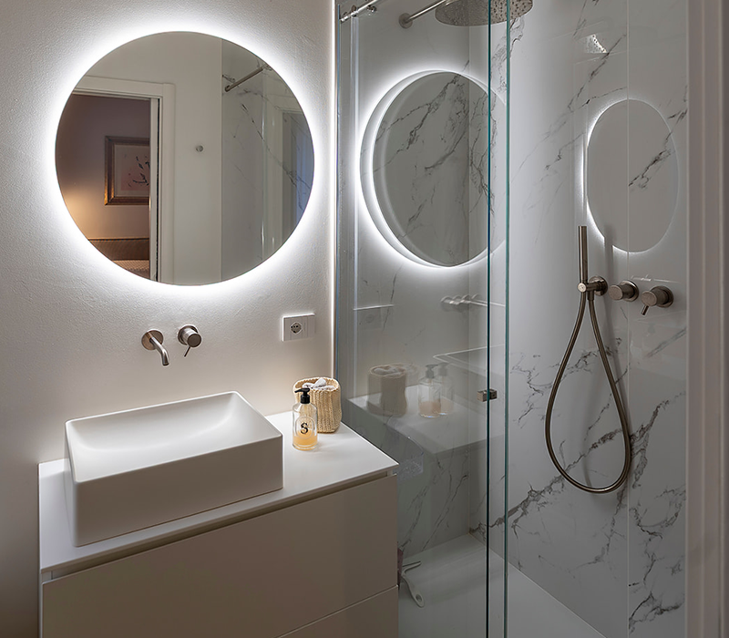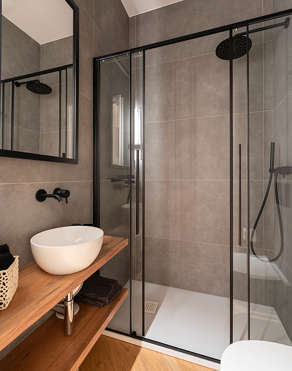 The bathrooms combine bold materials: stone-effect porcelain and marble finishes. The simplicity of the lines is enriched by pop-colored design elements, breaking the rigidity of the surfaces and making each space more personal and welcoming.