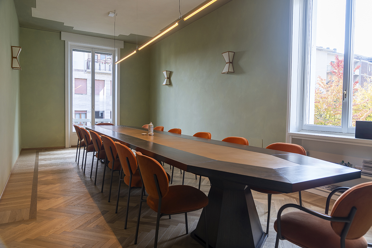 Lo showroom si sviluppa su tre livelli completamente vetrati, creando un dialogo continuo tra interno ed esterno. Il piano terra accoglie lo spazio espositivo principale. Qui la collezione di lampade è protagonista e viene presentata in un ambiente essenziale che permette alla luce di diventare elemento architettonico. Le superfici e i materiali sono scelti per esaltare l’effetto luminoso delle installazioni. Il primo piano ospita ulteriori aree espositive e spazi di lavoro condivisi, pensati per favorire confronto e collaborazione. L’ambiente mantiene la stessa continuità visiva dello showroom, creando un equilibrio tra dimensione professionale ed esperienza del visitatore. Il secondo piano è dedicato a zone più raccolte, con aree relax e spazi di accoglienza che permettono di vivere lo showroom anche come luogo di incontro. L’atmosfera complessiva è caratterizzata da ambienti armoniosi e confortevoli, dove la luce diventa parte integrante dell’architettura.