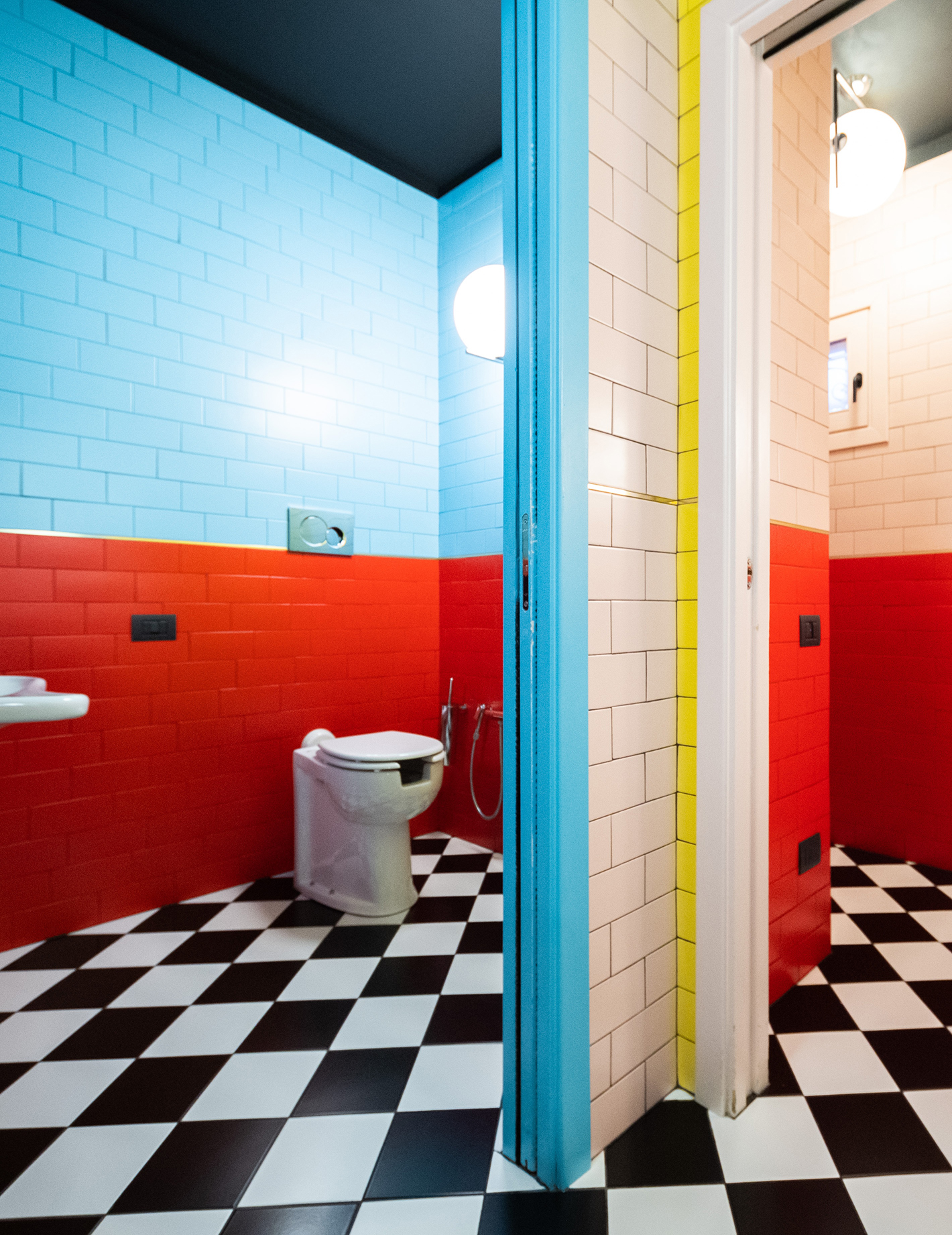 Le pareti sono animate da piastrelle lucide nei toni del rosso, dell’azzurro e del giallo, che definiscono gli ambienti e contribuiscono a creare un’atmosfera dinamica e informale. I bagni introducono un elemento più grafico con pavimentazioni a scacchi bianco e nero e rivestimenti ceramici dai colori pieni.