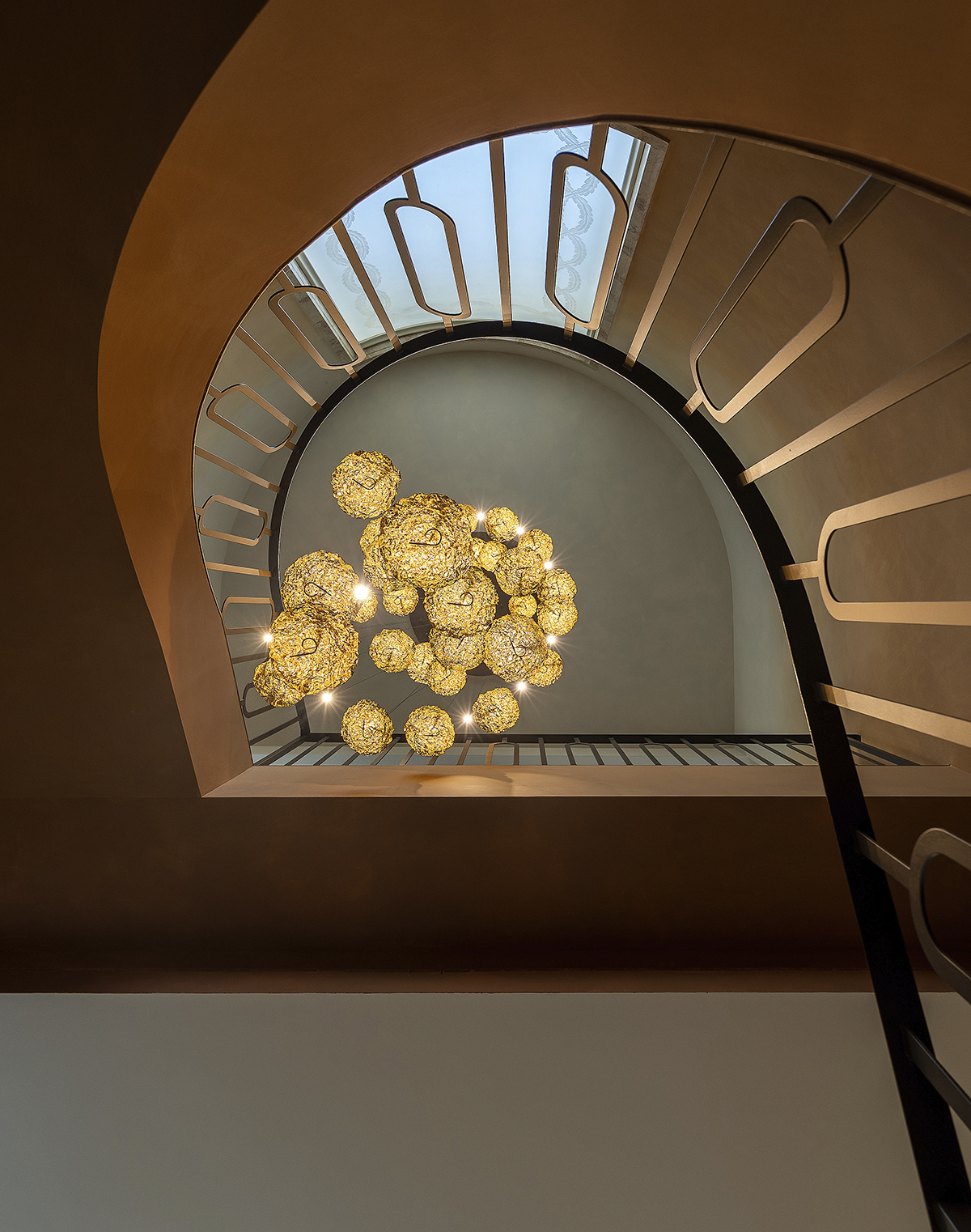 La scala centrale, con il suo andamento curvo e scenografico, diventa uno degli elementi architettonici più riconoscibili dell’intervento, accompagnando il visitatore attraverso i diversi livelli dell’edificio.