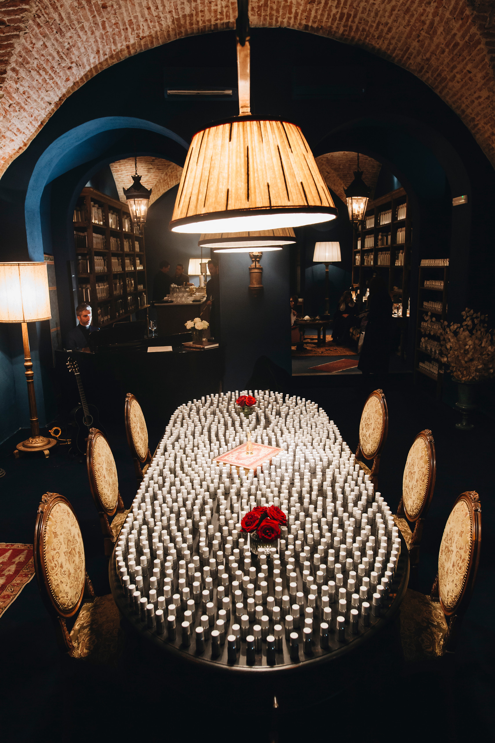 Le mura in laterizio, le volte a crociera e il pavimento restaurato raccontano l’anima storica dell’edificio, mentre il progetto contemporaneo costruisce un ambiente accogliente e sensoriale.