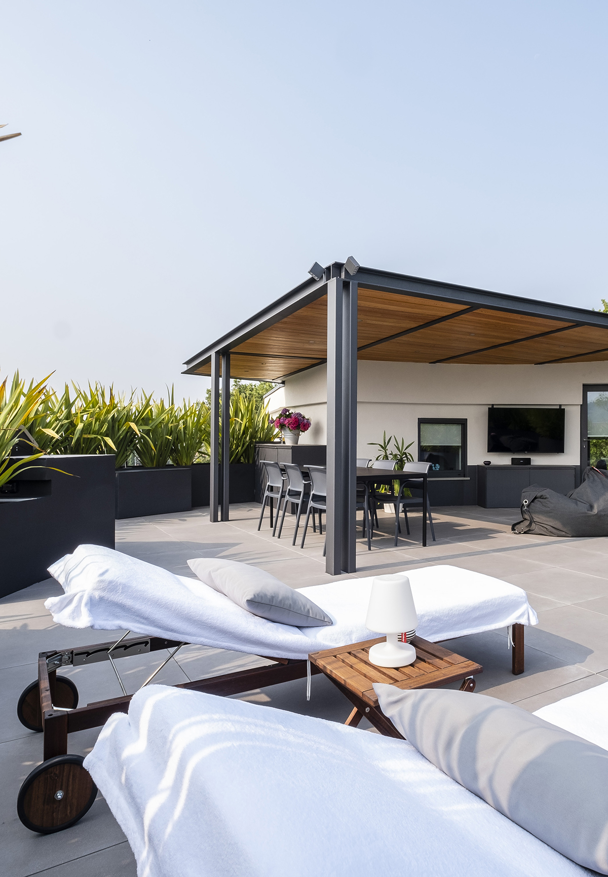 Gli arredi sono stati progettati attraverso un processo di interior design su misura, con soluzioni integrate e materiali di pregio selezionati per valorizzare proporzioni, luce e percezione dello spazio. Il piano superiore ospita uno studio e una seconda camera con accesso diretto alla terrazza panoramica, completando una distribuzione pensata per garantire comfort e funzionalità.