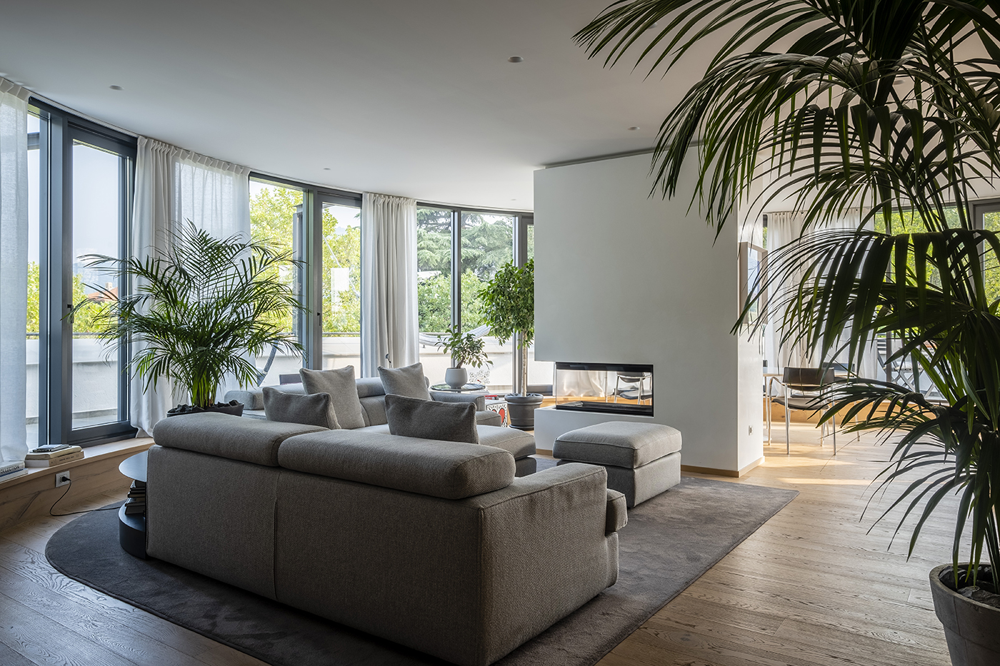 L’ingresso conduce a un ampio open space in cui living, cucina e area pranzo si sviluppano in continuità, accompagnando l’andamento curvo dell’architettura. La camera padronale con sala guardaroba e i bagni completano la zona principale, mantenendo uniformità materica e qualità esecutiva.